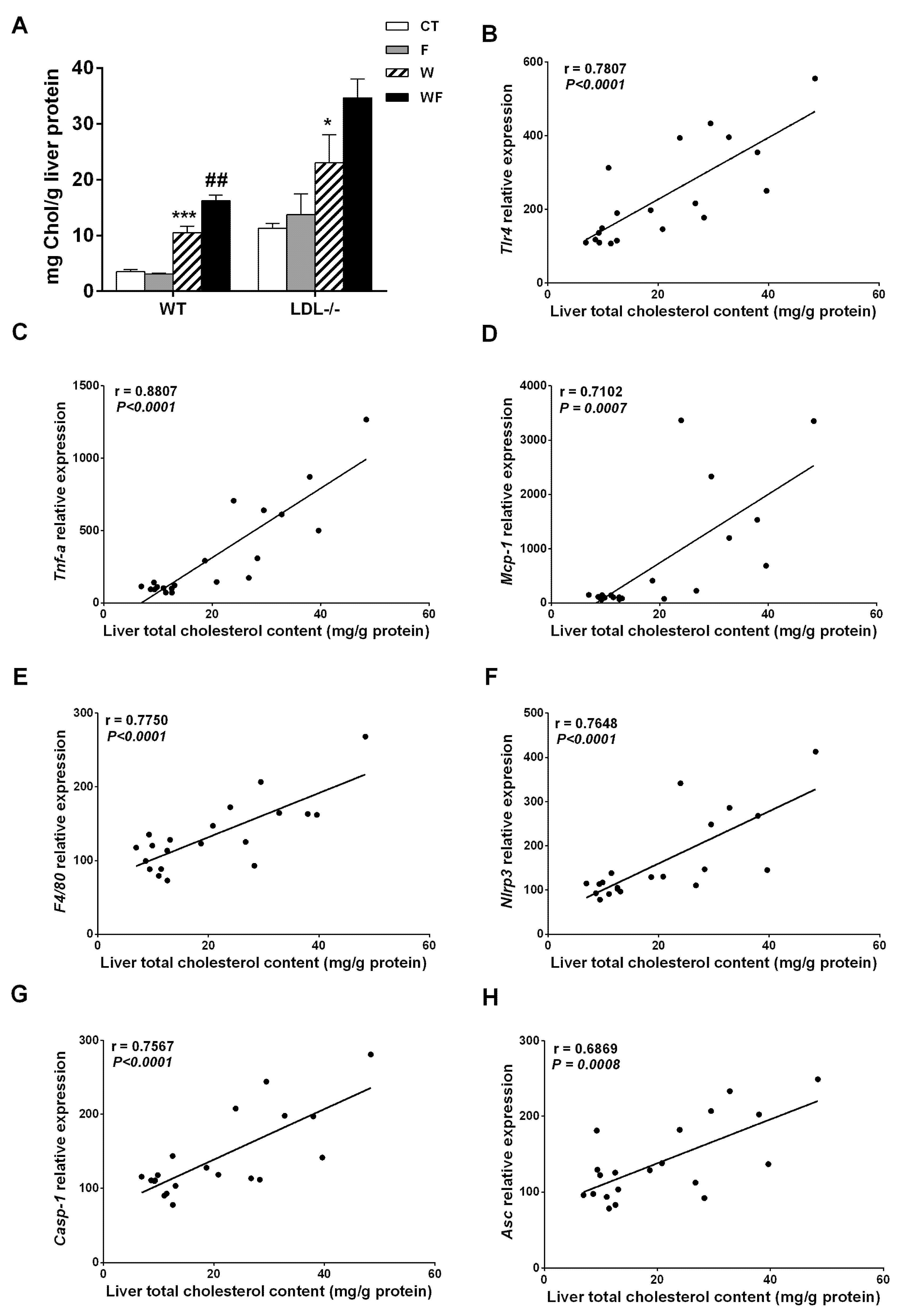 (A) Liver cholesterol levels from wild-type (WT) and LDL-R−/− mice fed standard solid-chow (CT), standard solid-chow plus a 15% fructose solution ad libitum (F), Western solid-chow (W), and Western solid-chow plus a 15% fructose solution ad libitum (WF), expressed as mean ± SEM of 9–10 animals; Data were obtained from [17,18]. Correlation between liver cholesterol content and mRNA expression of pro-inflammatory molecules including: (B) toll-like receptor 4 (tlr4); (C) tumor necrosis factor (TNF-α); (D) monocyte chemoattractant protein-1 (mcp-1); (E) f4/80; (F) NLR family pyrin domain containing 3 (nlrp3); (G) caspase-1 (casp1) and (H) apoptosis-associated speck-like protein containing a caspase-recruitment domain (asc). Statistical analysis was performed using two tailed Pearson or Spearman correlation. R indicates correlation coefficient.