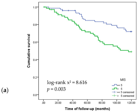 Figure 1 shows the Kaplan–Meier survival curves for 120 months according to MIS, energy intake, and protein intake. The survival rate was significantly lower in patients with MIS > 5, protein intake <0.8g/kg and energy intake <25 kcal/kg.