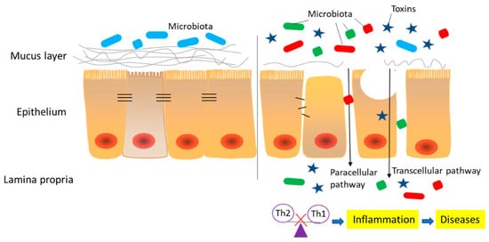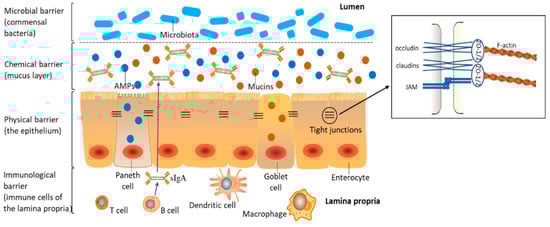 The immunological barrier comprises immune cells in LP (e.g., dendritic cells, resident macrophages, B cells, and T cells) and the secreted immune mediators (e.g., secretory immunoglobulin A (sIgA) and cytokines) [,,]. SIgA is generated by B cells in the LP, transposed across the epithelium, and secreted into the mucus layer []. Cytokines are the important regulators in inflammatory and immune responses, and they are secreted by immune cells and epithelial intestinal cells [].
