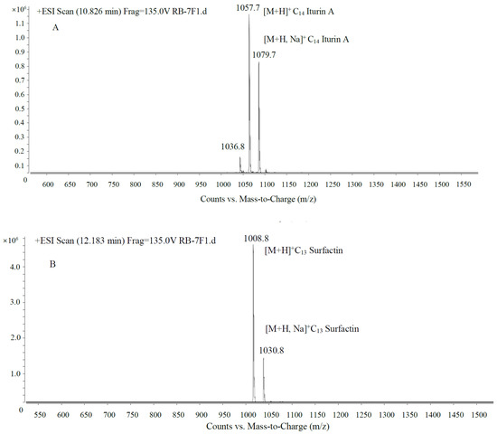 Antibiotics produced by Paenibacillus polymyxa 7F1 were separated using HPLC-MS. Three peaks were analyzed to confirm the active peak. The molecular weight of the chemicals was elucidated by LC-ESI mass spectrometry [23,24]. Data from the positive ion mass spectrum analysis showed that antibiotics produced by Paenibacillus polymyxa 7F1 contain a variety of compounds, three peaks showed good antagonistic effect among them, the three active peaks were analyzed by secondary mass spectrometry, [M+H]+ ion peaks were 1057.7, 1008.8, and 1022.8, respectively (Figure 6). They corresponded to C14 iturin A, C13 surfactin, and C14 surfactin, respectively.