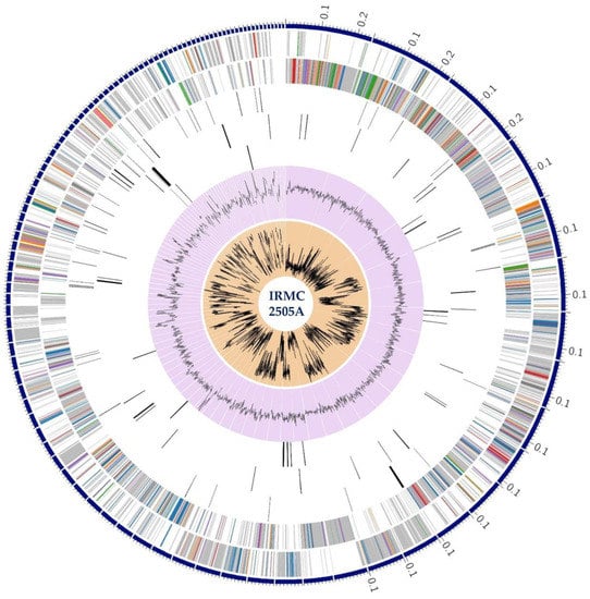 Phylogenetic analysis confirmed the phylotype and found 100% similarity between our isolate sequences, C. perfingens ATCC 13124 195103.10, and C. perfringens str. 13 195102.6 species. The last species, C. perfringens str. 13, was sequenced for the first time in 2002 by Shimizu et al. It is a natural isolate found in the soil and classified as a type A strain []. Genome annotation distribution in IRMC2505A showed that the average genome length, GC content, and rRNA copy number were 4,322,225 bp, 28.28%, and 7, respectively. This anaerobic organism had several genes belonging to metabolism (523), protein processing (238), virulence (100), cellular processes (179), energy (135), and DNA and RNA processing (107,61). A recent study claimed that C. perfringens has the highest genome plasticity (by calculating the openness index (OI)) out of 51 other bacterial species. In other words, this bacterium has a highly open genome to acquire new adaptive genes for survival in hostile external environments. These properties are reflected by its low GC content (around 28%) and high 16S rRNA gene copy number [].