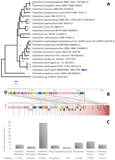 (A): Phylogenetic tree of the IRMC2505A genome. The blue arrow indicates the IRMC2505A genome. Tree Analysis Statistics: Requested genomes—22; Genomes with data—22; Max allowed deletions—0; Max allowed duplications—0; Single-copy genes requested—100; Single-copy genes found—100; Num protein alignments—100; Alignment program—mafft; Protein alignment time—189.9 s; Num aligned amino acids—46380; Num CDS alignments—100; Num aligned nucleotides—139140; Best protein model found by RAxML—LG; Branch support method—RAxML Fast Bootstrapping; RAxML likelihood—2571915.6763; RAxML version—8.2.11; RAxML time—3978.6 s. A list of genes used for tree analysis statistics is listed in Supplementary Table S4. (B): Genome comparison represents homologous regions between Clostridium perfringens IRMC2505A and ATCC 13124 195103.10. Alignable sequence blocks are common between the present study’s clinical isolate (lower) and the reference (upper) C. perfringens ATCC 13124 195103.10. Homologous locally collinear blocks between IRMC2505A and ATCC 13124 195103.10 are identified by the same color and connected with a line. (C): Number of specialty genes and the specific source database where homology was found.