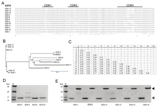 To generate nanobodies against SEB, one camelid was immunized with a SEB toxoid as the antigen. Total RNA was isolated from PBMCs of the immunized camelid and the coding sequences of VHH were amplified by RT-PCR for construction of an enriched SEB-binding phage display library. Upon transformation into E. coli strain TG1, a VHH phagemid library was constructed with a diversity of 1.7 × 109. Phage antibody particles displaying the VHH were produced and subjected to three cycles of bio-panning in plates coated with SEB. Forty clones were randomly picked from the 3rd round-enriched pool to validate the specificity of enrichment. Through DNA sequencing, 12 unique VHH sequences were identified and a neighbor-joining tree revealed clusters of similar sequences (Figure 1A–C). There were several highly similar VHHs that only differed in a few amino acids in framework or CDR regions, such as VHHs SEB-1, SEB-15, SEB-10, SEB-13, and SEB-18. However, highly divergent VHHs were also identified. For example, VHHs SEB-6 and SEB-9 are 98% identical but share at most 75% sequence identity with the other ten nbs. VHHs SEB-5 and SEB-20 shared the least sequence similarity to the other 10 nbs. We suspected that differences in the framework sequences would result in heterogeneity of protein stability or solubility, whereas CDR sequence variability might affect SEB reactivity. Therefore, we set out to further purify and characterize these VHH nbs.