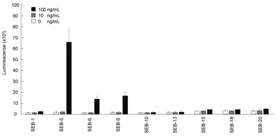 The purified nbs were then tested for their reactivity to SEB by direct ELISA. Figure 2 shows that the nine nbs bound SEB in different capacities, with nb SEB-5 producing the highest signal. However, the sensitivity of detection was poor, with the limit of detection (LOD) being above 10 ng/mL for all nbs tested by direct ELISA. This result was similar to the results reported previously [].