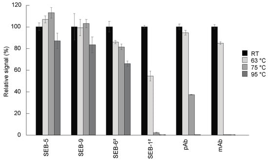 One of the hallmarks of camelid-derived nbs is their ability to reversibly melt and refold across a broad range of temperatures that are not permissible with conventional antibodies [,]. We assessed the heat stability of the SEB nbs by measuring their activities with a direct ELISA after incubation for 10 min at 63 °C, 75 °C, or 95 °C, compared to antibodies held at room temperature (Figure 4). The most stable molecules were SEB-5 and SEB-9, which retained more than 80% of the binding activity, followed by the SEB-62 nb, which retained more than 60% of the binding activity after 10 min at 95 °C. The next most stable antibody tested was the pAb, which was partially active after treatment at 75 °C, but completely inactivated after treatment at 95 °C for 10 min. Finally, SEB-12 and the mAb were only partially active after treatment at 63 °C, and almost completely inactivated at 75 °C and above. Previous studies [] showed that an SEB nb retained 100% of its binding activity after 20 min at 95 °C, while a conventional antibody lost all binding after 10 min at 95 °C. These data suggest that most nbs are more thermally stable than conventional antibodies and could be preferable options in assays designed to minimize the effects of temperature fluctuations.