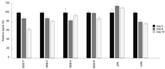 Antibodies were stored either at room temperature or at 4 °C for 1, 8, and 16 days and used in a direct ELISA at 50 ng/mL. Plates were coated overnight with SEB at 5 μg/mL or with PBS only. Each reading was corrected by subtracting the average of the PBS control. The relative change in signal was calculated as: (corrected CPS at room temp/average corrected CPS at 4 °C) × 100.