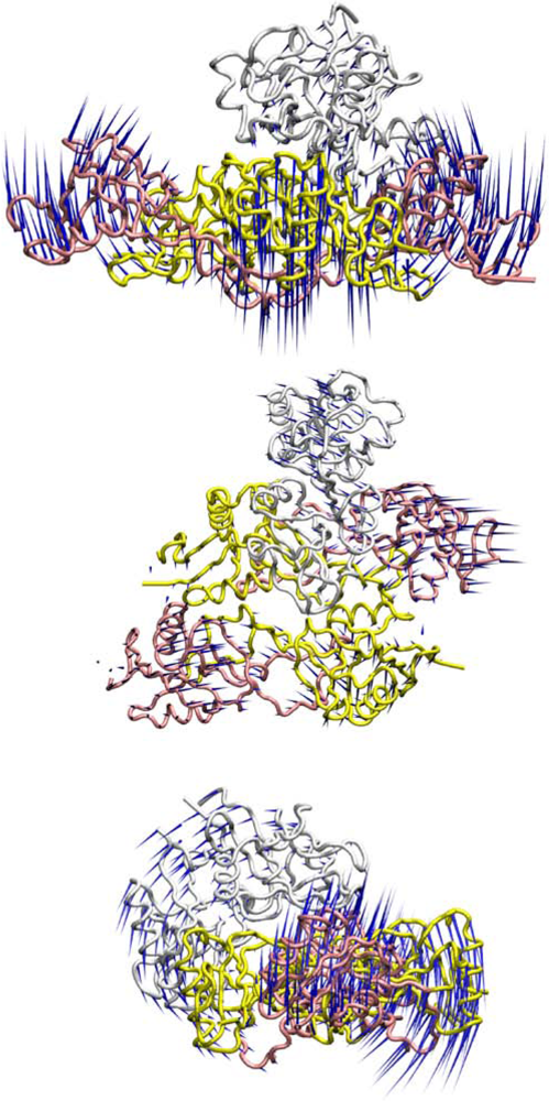 Dynamic analyses of a model of the interaction of dimeric CLEC-2 (white) with tetrameric rhodocytin. The rhodocytin α- and β-chains are coloured yellow and pink, respectively. The porcupine plots represent the principal mode of conformational variability of the Cα atoms calculated from a CONCOORD ensemble using the model of the rhodocytin-CLEC-2 interaction based on the crystal structure of rhodocytin, and a model of the dimeric structure of CLEC-2. Blue cones represent the direction of each motion; the length of the cone is proportional to the amplitude of the motion. The top image represents a 90° counter-clockwise rotation of the central image about the X-axis. The bottom image represents a 90° clockwise rotation of the top image about the Y-axis.