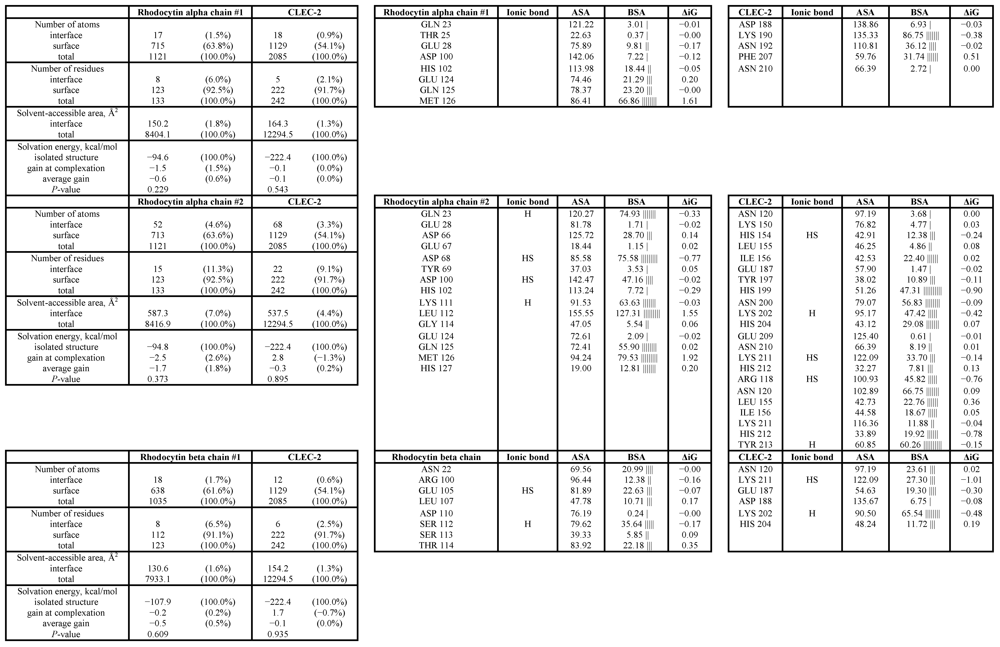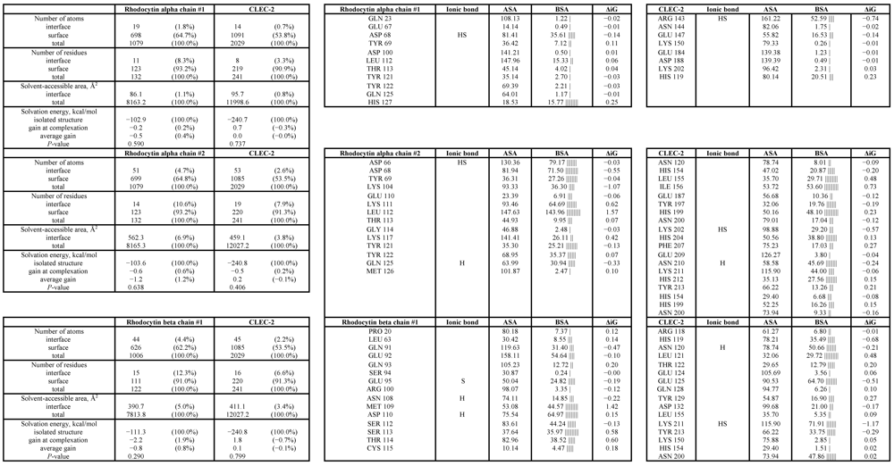 Contact information and interfacing residues involved in the model interaction of two copies of dimeric CLEC-2 with tetrameric rhodocytin. Key: H = residues making hydrogen bonds, S = residues making a salt bridge, ASA = accessible surface area (Ų), BSA = buried surface area (Ų), ΔiG = solvation energy effect (kcal/mol), |||| = buried area percentage, one bar per 10 %.
