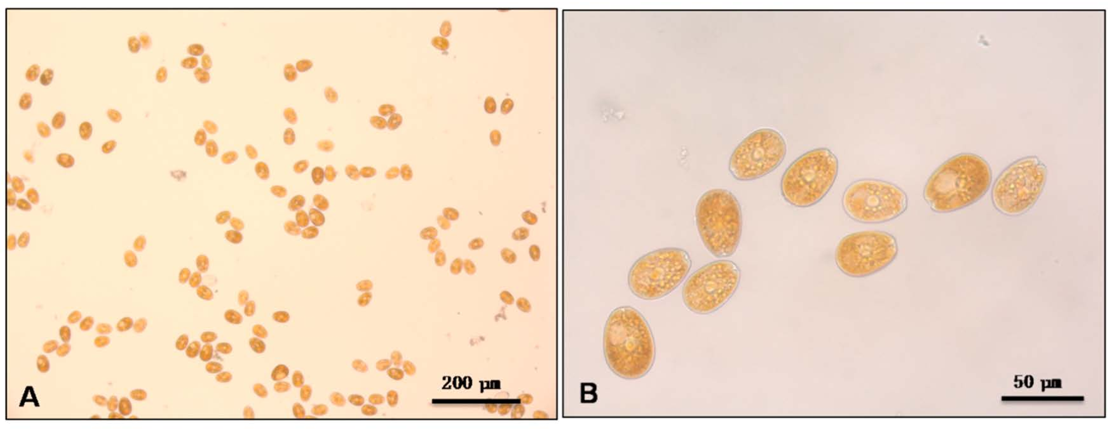 Microscopy images of Prorocentrum lima cells; (A) 10X; (B) 40X.
