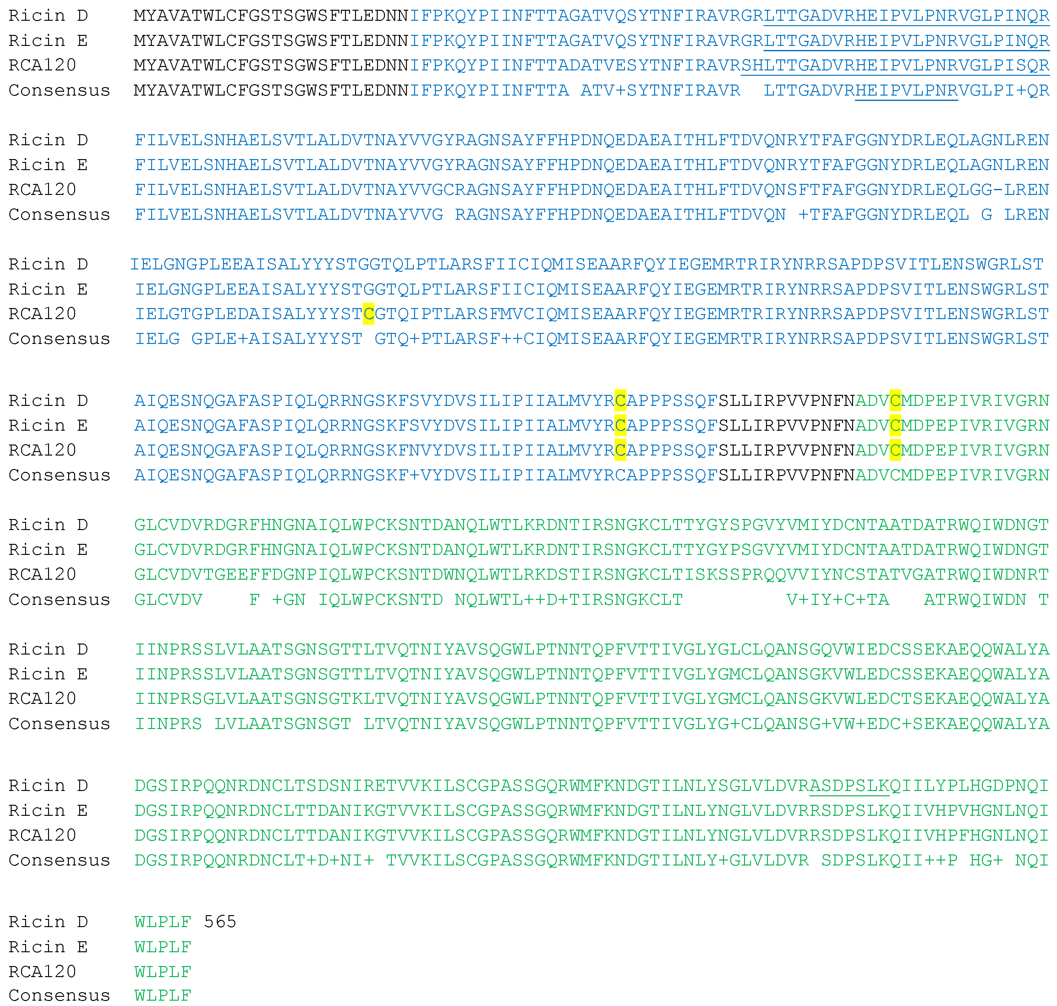 Amino acid sequence alignment of ricin D, ricin E and RCA120. Amino acids which differ are noted in the consensus line as an empty space or as “+” if the changes are conserved. The A-chain is depicted in blue and the B-chain in green. Peptides used for targeted mass spectrometric identification/differentiation are underlined. Highlighted cysteines indicate disulfide bond formation.