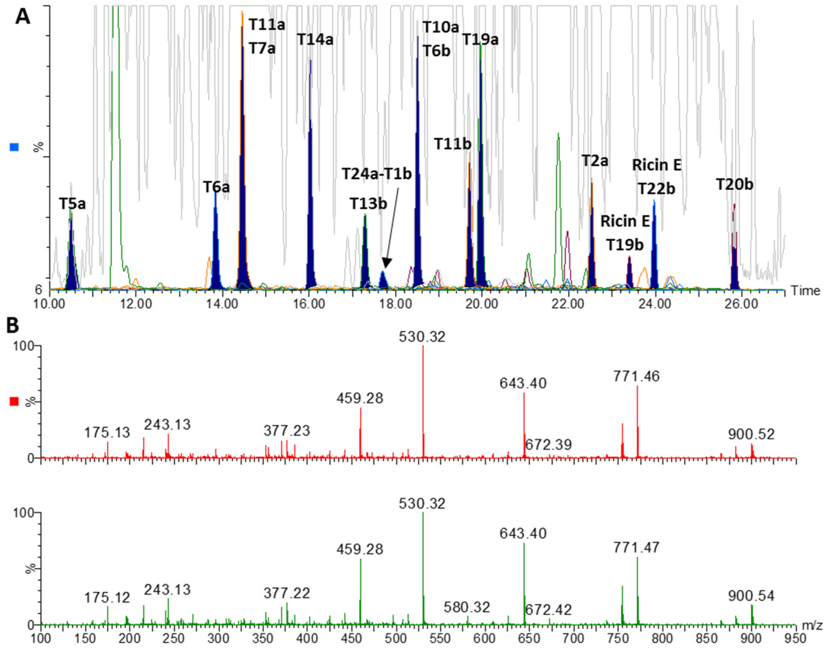 MS/MS amino acid sequencing of ricin was first reported in 2005 [24]. In this work, ricin was extracted from castor beans and digested with trypsin with the resultant tryptic peptides analyzed with a QTOF mass spectrometer. This yielded fourteen peptides from the A-chain of ricin and sixteen peptides from the B-chain, in addition to peptides specific for RCA120 [22]. Another similar method includes a shortened digestion time without prior reduction of disulfide bonds, in which the peptides from the A-chain, peptides from the B-chain and the peptide containing the intact interchain disulfide bond verifying the presence of the link between the A- and B-chains were identified and differentiated from RCA120 [25]. This approach was reported for the identification of ricin spiked into complex matrices such as milk, apple juice, serum and saliva [26], in surface swabs from a public health investigation [27], as well as identification of ricin and abrin in a forensic investigation [28].