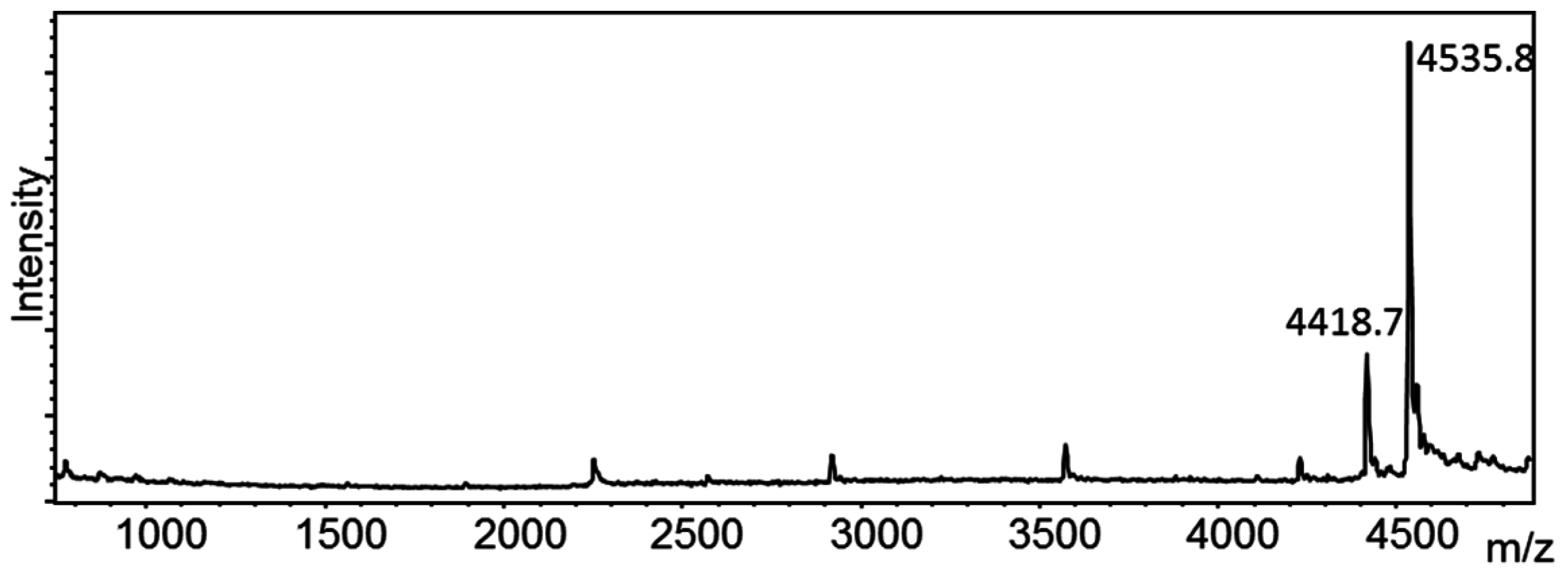 Mass spectrum of the reaction of an RNA substrate with ricin; the peak at m/z 4535.8 corresponds to the mass of the intact substrate and the peak at m/z 4418.7 corresponds to depurination of the RNA substrate by ricin.