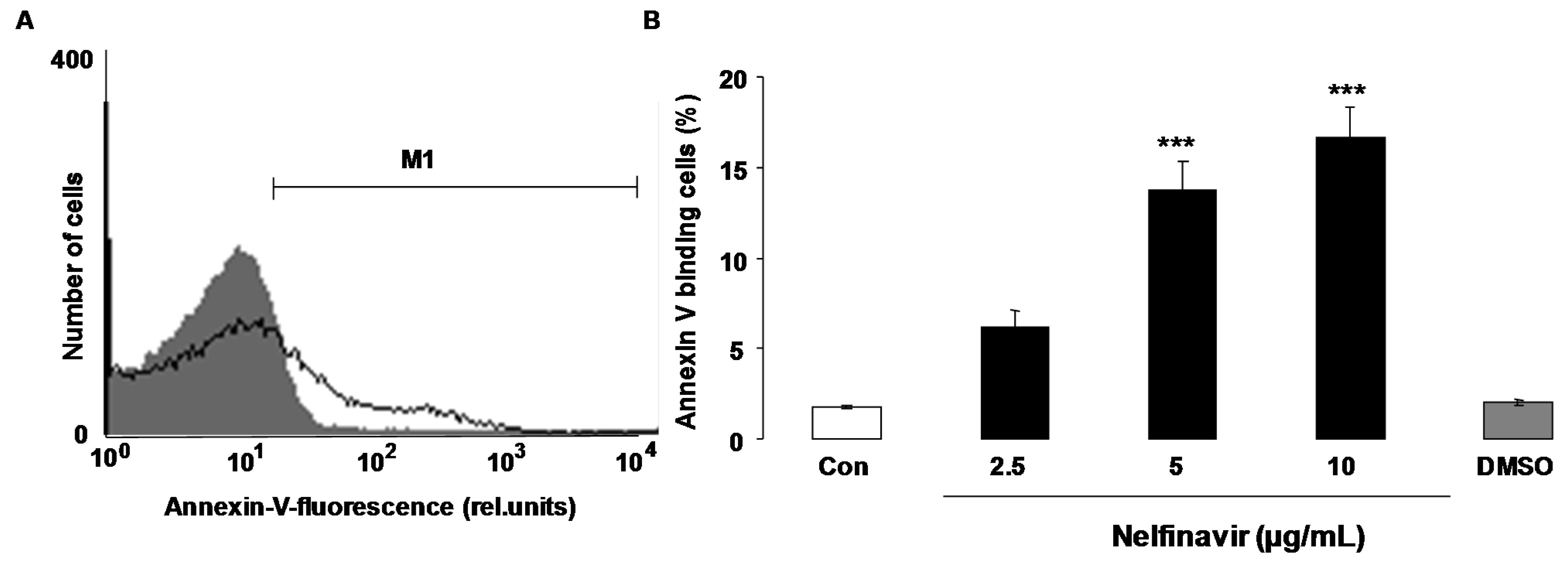 Effect of nelfinavir on phosphatidylserine exposure. (A) Original histogram of annexin-V-binding of erythrocytes following exposure for 48 h to Ringer solution without (grey area) and with (black line) presence of 10 µg/mL nelfinavir. M1 indicates the annexin-V-fluoresence defining the percentage of annexin-V-binding erythrocytes; (B) Arithmetic means ± SEM of erythrocyte annexin-V-binding (n = 15) following incubation for 48 h to Ringer solution without (white bar) or with (black bars) presence of nelfinavir (2.5–10 µg/mL). For comparison, the effect of the solvent DMSO (1 µL/mL Ringer) is shown (grey bar). *** (p < 0.001) indicates significant difference from the absence of nelfinavir (ANOVA).