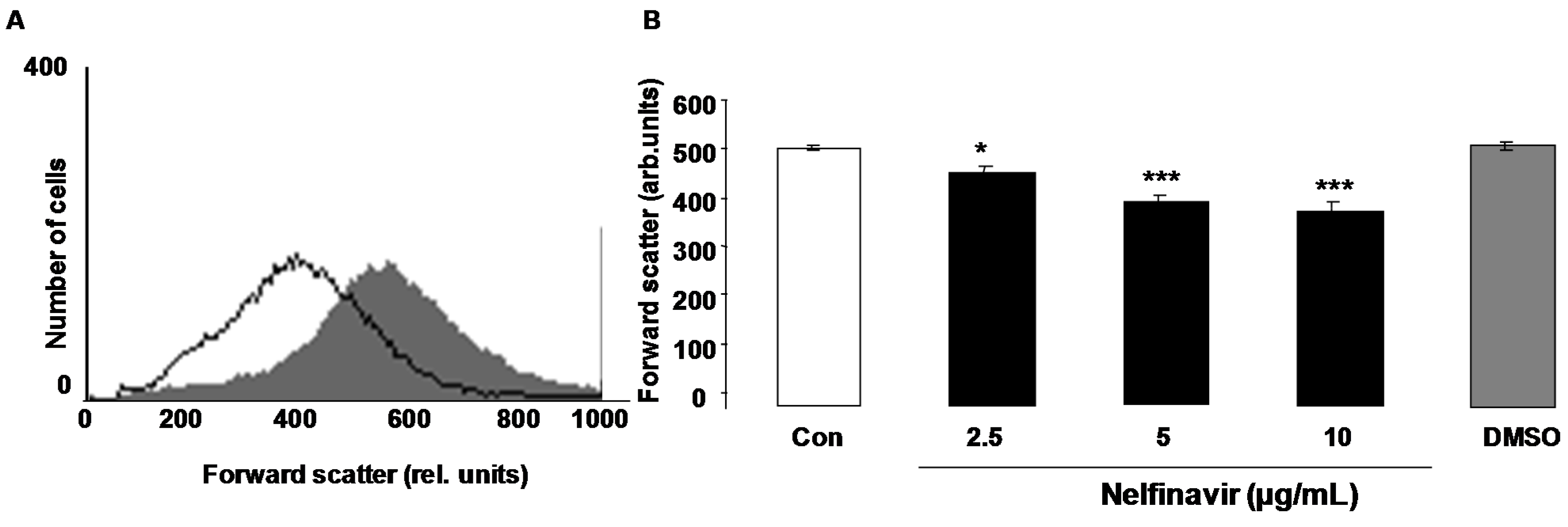 Effect of nelfinavir on erythrocyte forward scatter. (A) Original histogram of forward scatter of erythrocytes following exposure for 48 h to Ringer solution without (grey area) and with (black line) presence of 10 µg/mL nelfinavir; (B) Arithmetic means ± SEM (n = 15) of the erythrocyte forward scatter (FSC) following incubation for 48 h to Ringer solution without (white bar) or with (black bars) nelfinavir (2.5–10 µg/mL). For comparison, the effect of the solvent DMSO (1 µL/mL Ringer) is shown (grey bar). * (p < 0.05), *** (p < 0.001) indicate significant difference from the absence of nelfinavir (ANOVA).
