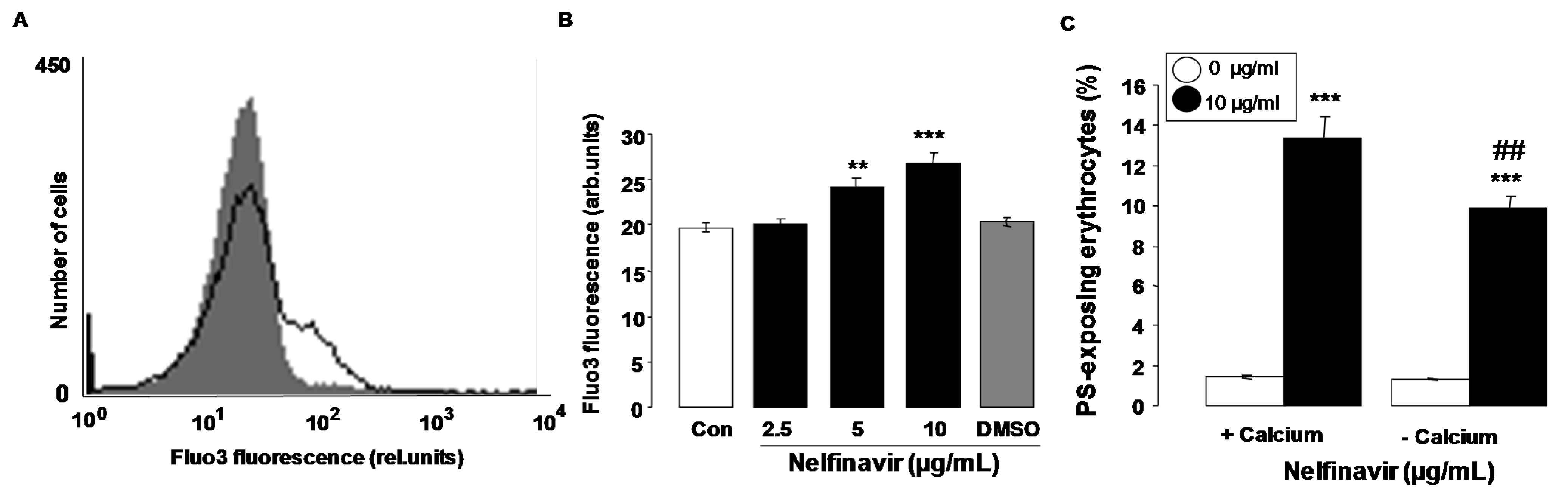 Effect of nelfinavir on erythrocyte Ca2+ activity and Ca2+ dependence of nelfinavir-induced phosphatidylserine exposure (A) Original histogram of Fluo3 fluorescence in erythrocytes following exposure for 48 h to Ringer solution without (grey area) and with (black line) presence of nelfinavir (10 µg/mL); (B) Arithmetic means ± SEM (n = 15) of the Fluo3 fluorescence (arbitrary units) in erythrocytes exposed for 48 h to Ringer solution without (white bar) or with (black bars) nelfinavir (2.5–10 µg/mL). For comparison, the effect of the solvent DMSO (1 µL/mL Ringer) is shown (grey bar). ** (p < 0.01), *** (p < 0.001) indicate significant difference from the absence of nelfinavir (ANOVA); (C) Arithmetic means ± SEM (n = 7) of annexin-V-binding of erythrocytes after a 48 h treatment with Ringer solution without (white bars) or with (black bars) 10 µg/mL nelfinavir in the presence (left bars, +Calcium) and absence (right bars, −Calcium) of Ca2+. *** (p < 0.001) indicates significant difference from the absence of nelfinavir, ## (p < 0.01) indicates significant difference from the respective value in the presence of Ca2+.