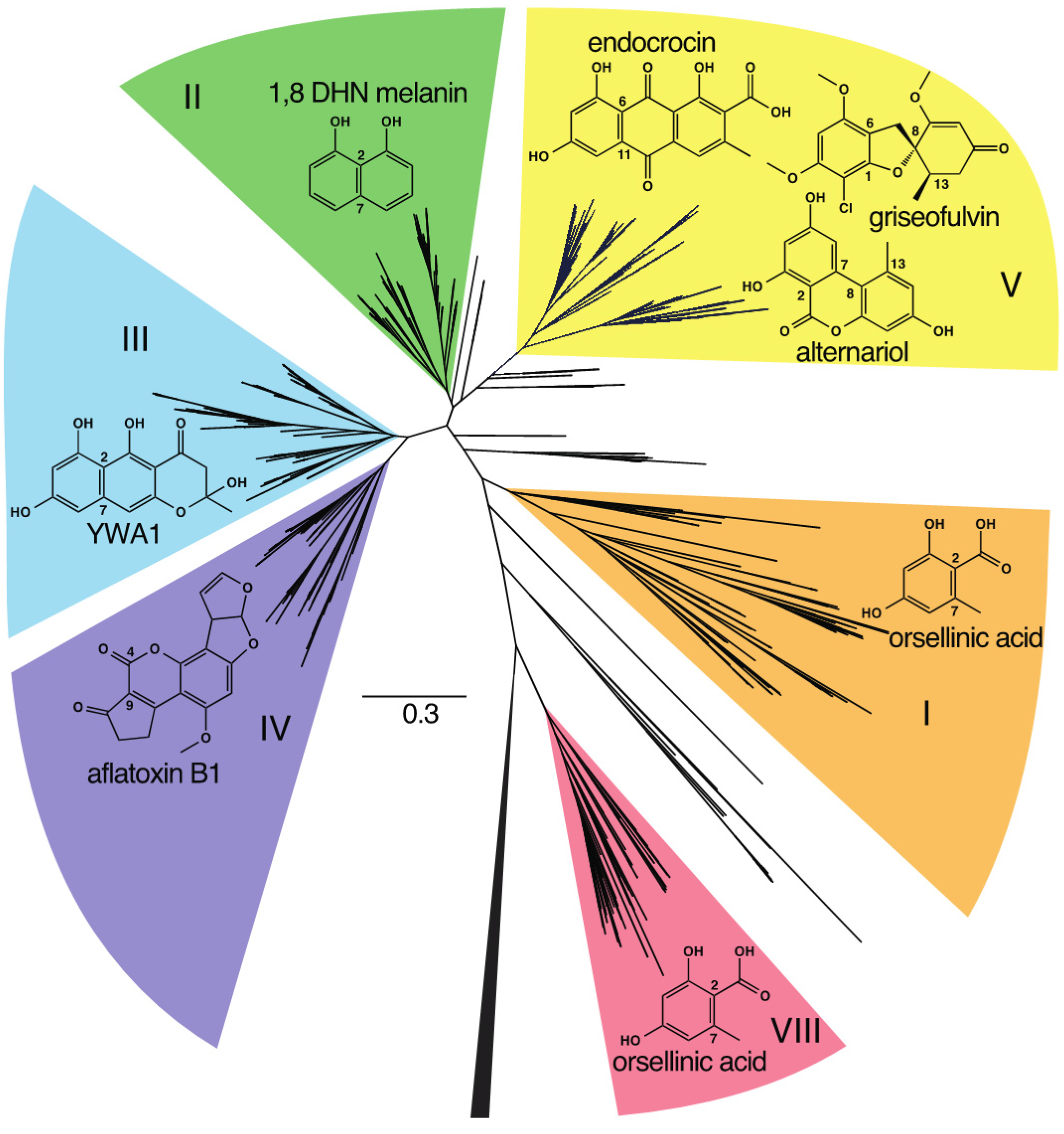 A maximum likelihood phylogenetic tree constructed with FastTree [60] using the KS domains of 908 NR-PKSs. Clades corresponding to characterized groups I–VIII are highlighted and labeled. No members of groups VI and VII were identified by our methods. Examples of structures produced by each group are shown in their respective highlighted regions and the numbering of the carbon-carbon bonds indicates the mode of cyclization of the PKSs that produce these compounds. The outgroup, consisting of the KS domains of 70 HR- and hybrid PKS/NRPSs, as well as the human fatty acid synthase, FASN, is collapsed.