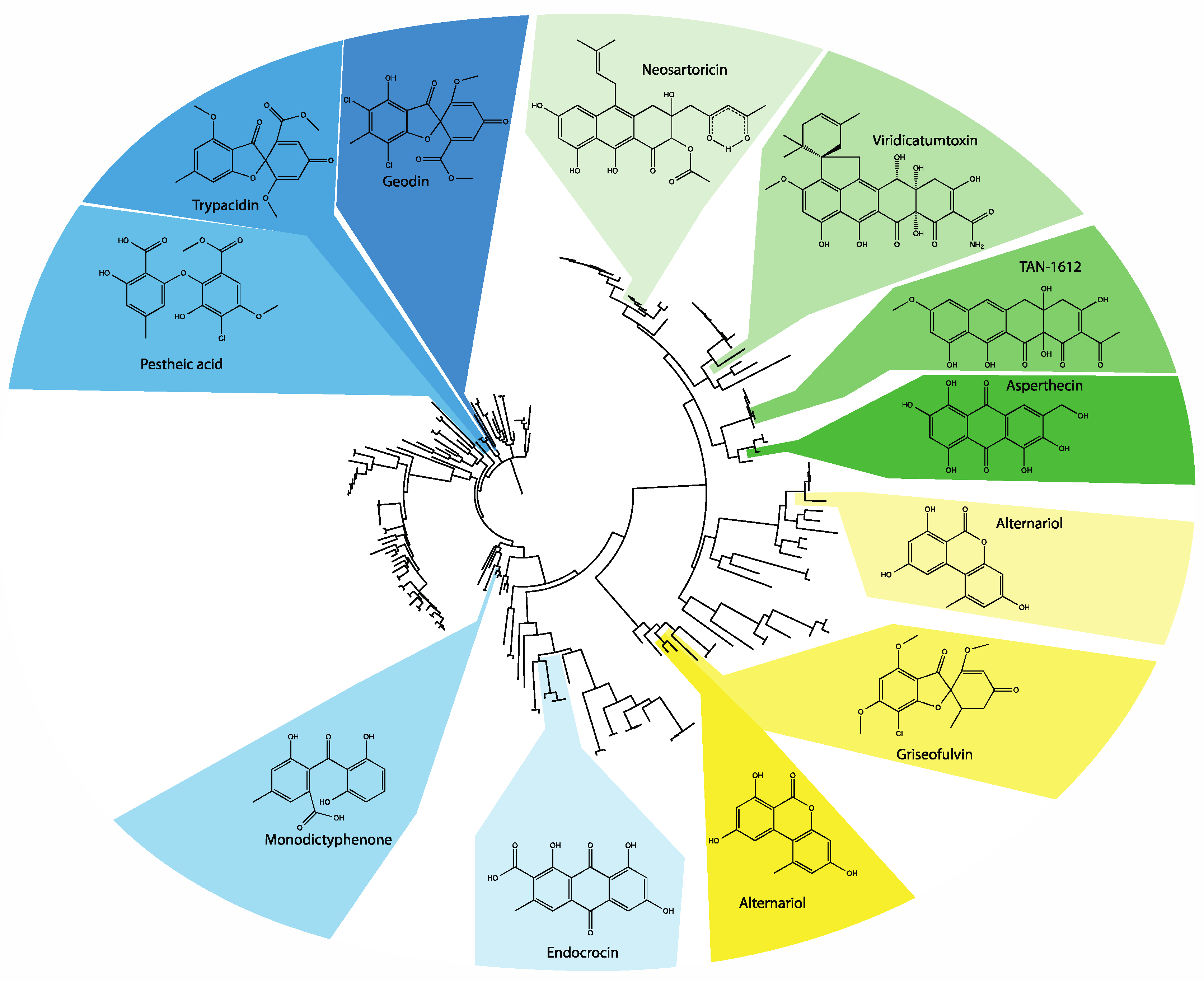 The Kingdom Fungi is well known for its ability to synthesize bioactive secondary metabolites (SMs), also known as natural products. The dominant taxa producing SMs belong to several filamentous ascomycete genera, many of which are renowned plant, insect, and/or human pathogens. Virulence is often associated with the production of toxic SMs in these fungi [1]. In nature, where studied, SMs afford various fitness advantages to the producing species ranging from protection from fungivory and physical insults (e.g., UV light) to competition with other microbes for niche securement [2,3,4].