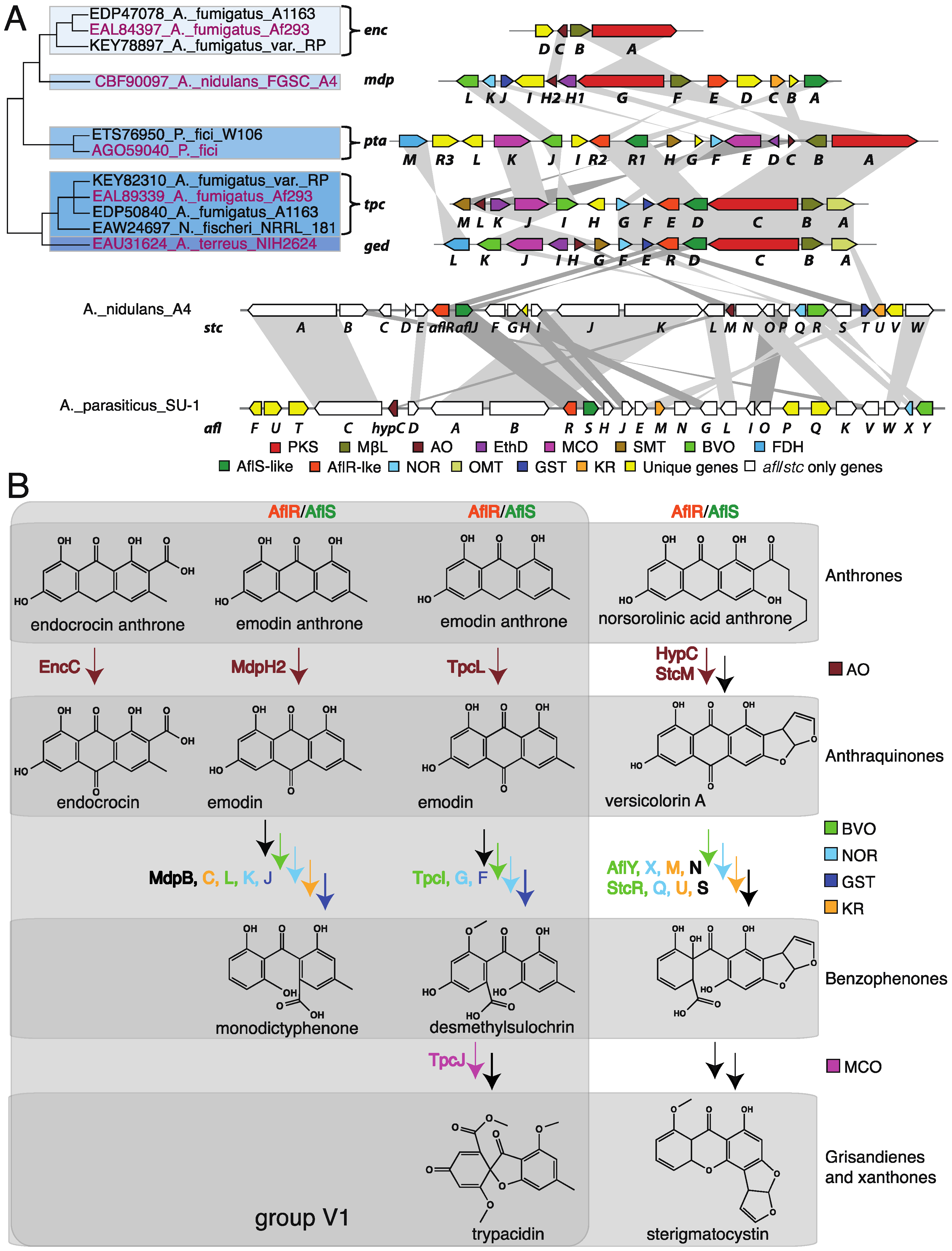 Previous phylogenetic analyses have used the whole PKS, the KS domain, or the PT domain for comparison, but these have been noted to reflect one another, indicating their coevolution [54]. These studies classified the NR-PKSs first into three subclades [55], then further into five [56], seven [54], and most recently eight groups [57]. These NR-PKSs are present in many ascomycetes and some basidiomycetes, though only members of group VIII have been identified in basidiomycetes [57] with only one characterized example to date [58]. These groups generally represent unique combinations of product length and cyclization register. Of the eight current groups, we focus on NR-PKSs belonging to the TE-less group V in this study (Figure 2). Group V has thirteen characterized gene clusters with eleven described products including endocrocin, monodictyphenone, trypacidin, geodin, pestheic acid, asperthecin, TAN-1612, neosartoricin, viridicatumtoxin, griseofulvin, and alternariol (Table 1, Figure 3). All group V PKSs lack a domain for product release, but they vary in the length (hepta- to decaketide) of their products; most make C6–C11 connections, but a couple of exceptional cases make C1–C6 or C2–C7 connections. Generally, the thioesterase activity is encoded in a separate but adjacent MβL-TE. Based on our analysis of the KS domains of 908 fungal PKSs identified through the NCBI’s BLAST utility and manually using AspGD (Figure S1), we have identified 188 PKSs belonging to group V (Figure S2). These PKSs are derived from 88 species of 39 genera distributed across five classes of ascomycetes (Table 1). Notably, no group V PKSs were identified in the well characterized Fusarium spp. [59]. This phylogenetic tree allowed us to visualize relationships between these unknown PKSs and the thirteen examples, thus defining the best contexts in which to deduce the functions of the putative clusters to which these PKSs belong.