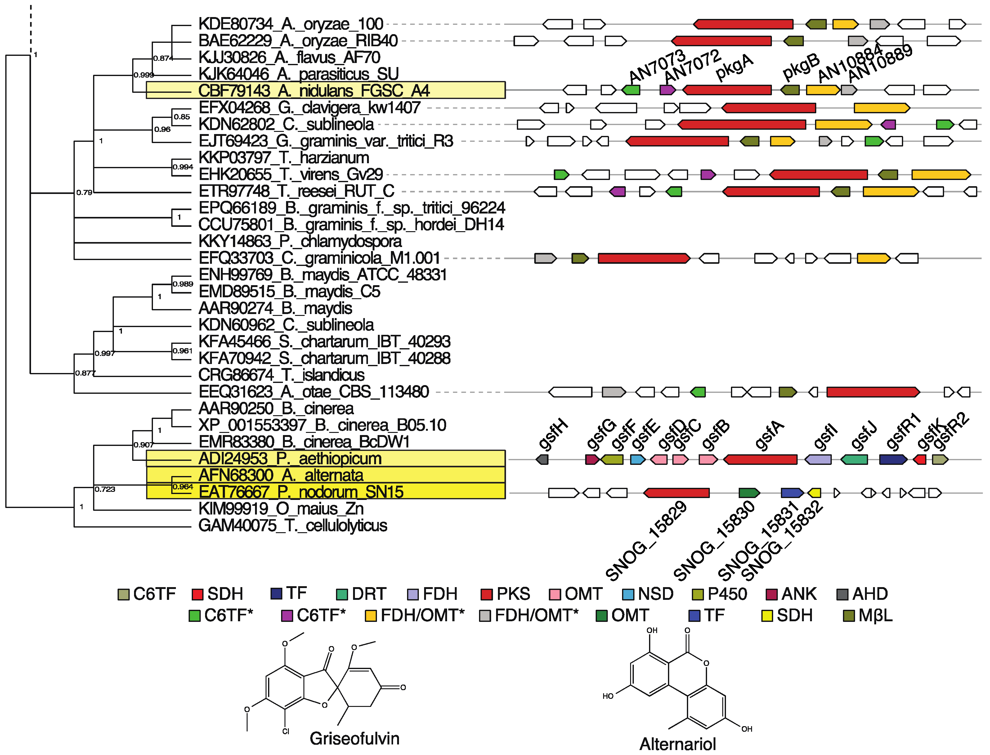 - Kroken, S.; Glass, N.L.; Taylor, J.W.; Yoder, O.C.; Turgeon, B.G. Phylogenomic analysis of type I polyketide synthase genes in pathogenic and saprobic ascomycetes. Proc. Natl. Acad. Sci. USA 2003, 100, 15670–15675. [Google Scholar] [CrossRef] [PubMed]