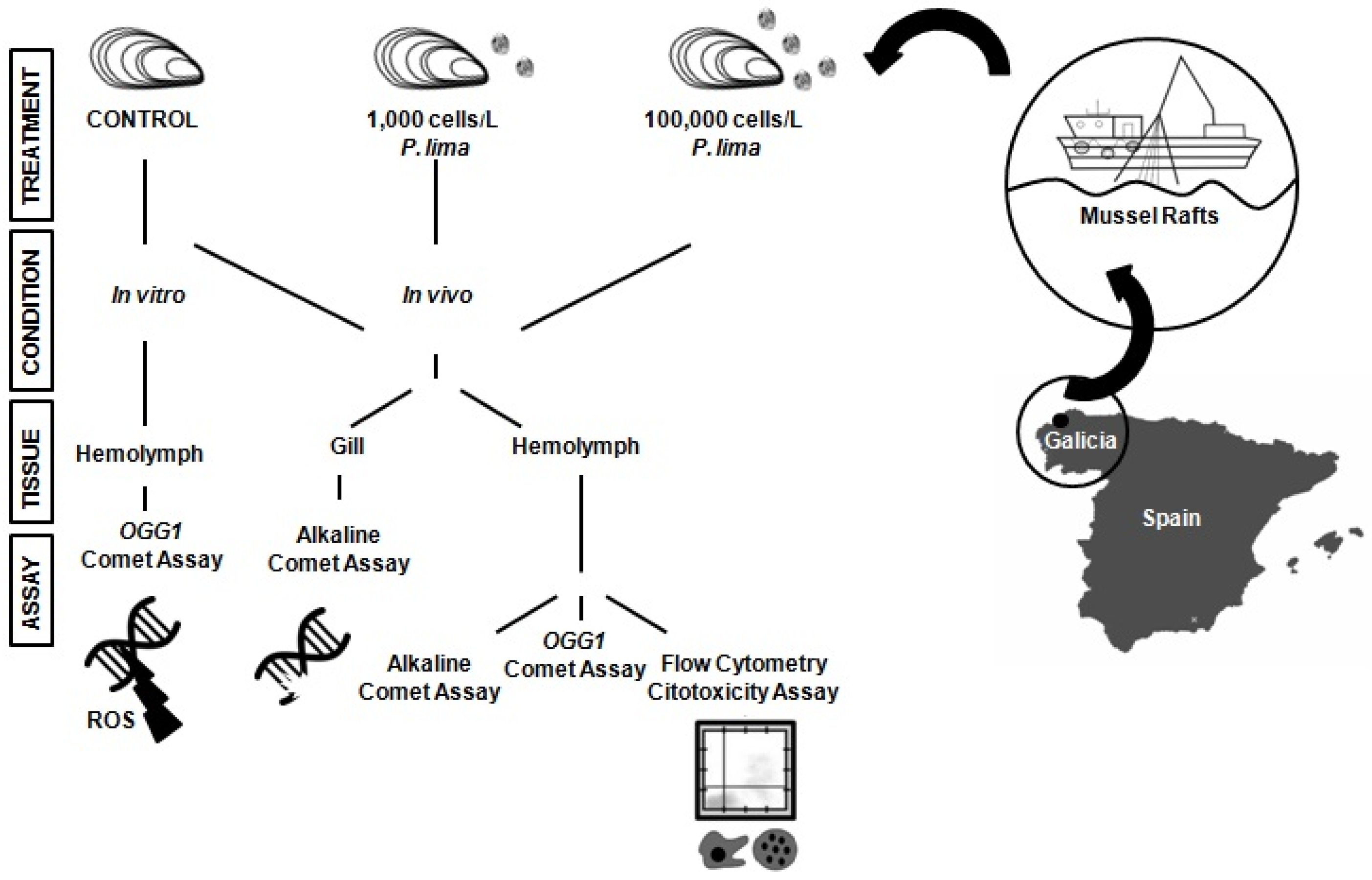 Schematic diagram describing the experimental design followed in the present work. Mussel specimens were collected and acclimated to laboratory conditions before exposing them in vivo to different cellular densities of the diarrhetic shellfish poisoning (DSP)-producing dinoflagellate P. lima for 24 h and 48 h. The genotoxic and cytotoxic effects of the exposure to P. lima were evaluated by means of the comet assay (alkaline and OGG1-modified) and flow cytometry in different cell types. A group of mussels was also exposed in vitro to okadaic acid (OA) to quantify oxidative DNA damage in hemolymph cells using the OGG1-modified comet assay.