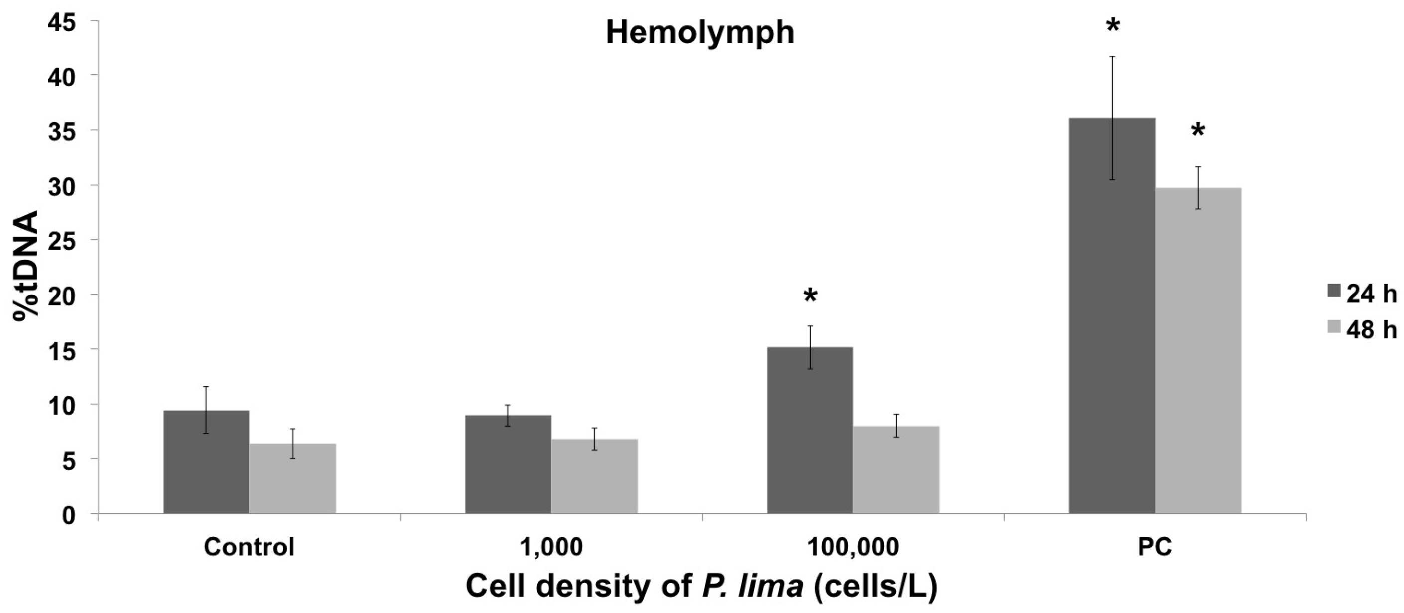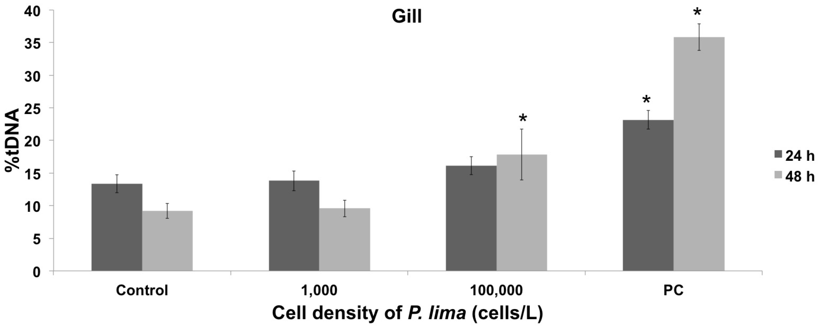 Quantification of DNA damage using the alkaline comet assay in mussel hemocytes after in vivo exposure to different cellular densities of P. lima for 24 h and 48 h. Control and PC represent negative and positive controls, respectively. The percentage of DNA in the comet tail is indicated by %tDNA. * indicates significant differences with respect to negative control in Mann-Whitney’s U-test (p < 0.05).