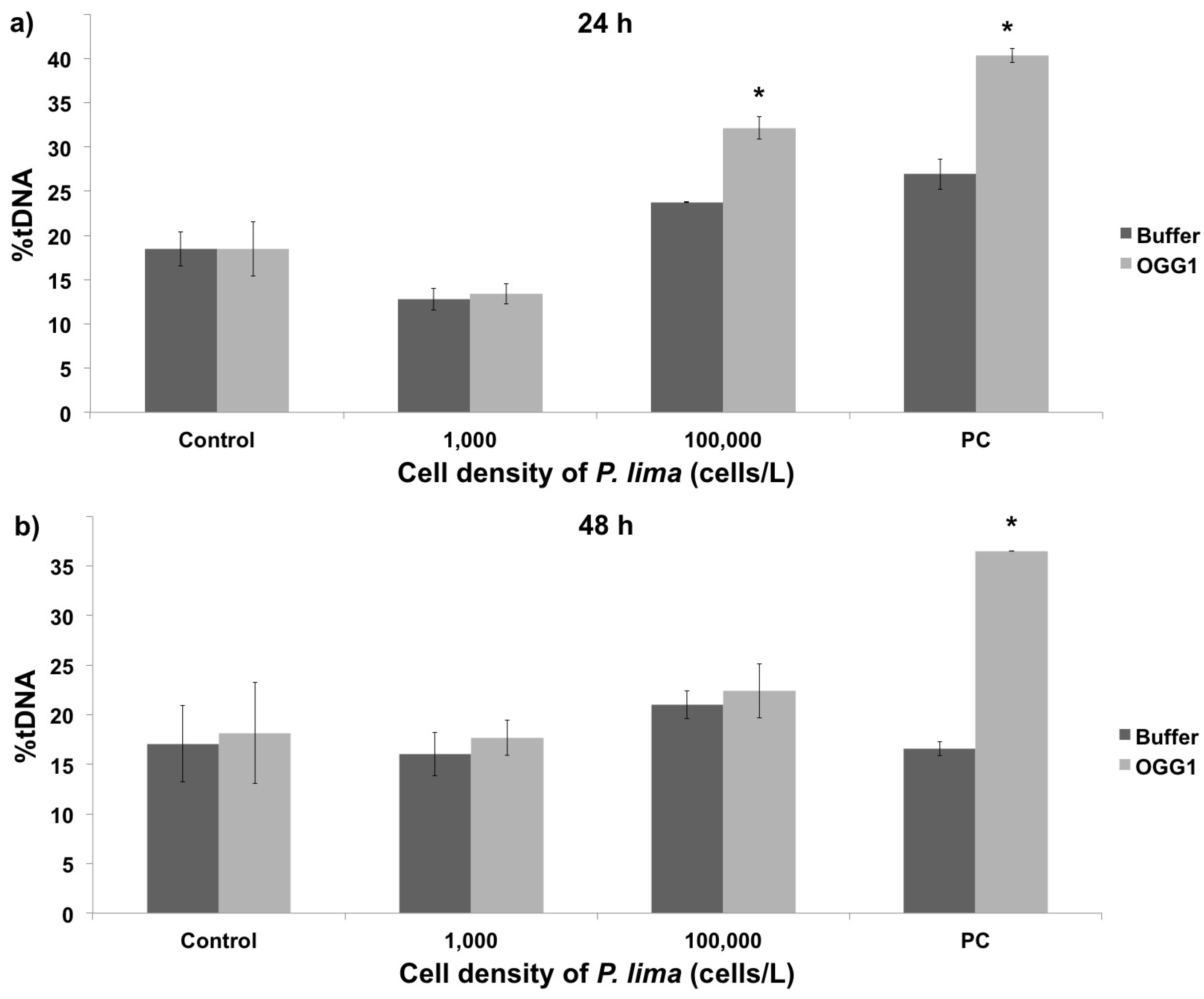 Quantification of oxidative DNA damage using the OGG1-modified comet assay in mussel hemocytes after in vivo exposure to different cellular densities of P. lima for 24 h (a) and 48 h (b). Controls and statistical analyses are as in Figure 4. * indicates significant differences in respect to buffer in Mann-Whitney’s U-test (p < 0.05).