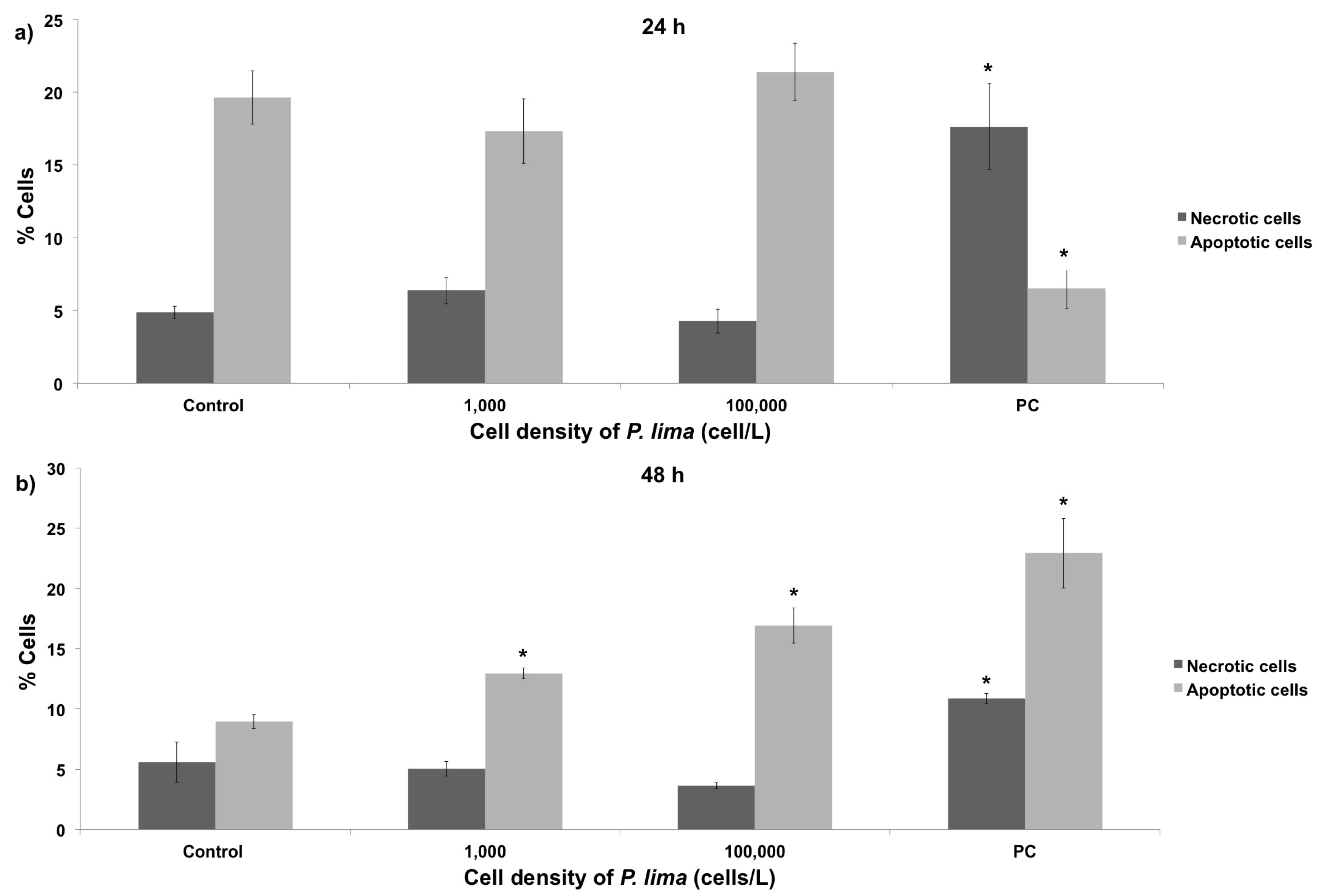 Flow cytometry evaluation of cytotoxicity in mussel hemocytes after in vivo exposure to different cellular densities of P. lima for 24 h (a) and 48 h (b). Control and PC represent negative and positive controls, respectively. The percentage of cells classified as necrotic or apoptotic is indicated by % Cells. * indicates significant differences in respect to negative control in Mann-Whitney’s U-test (p < 0.05).