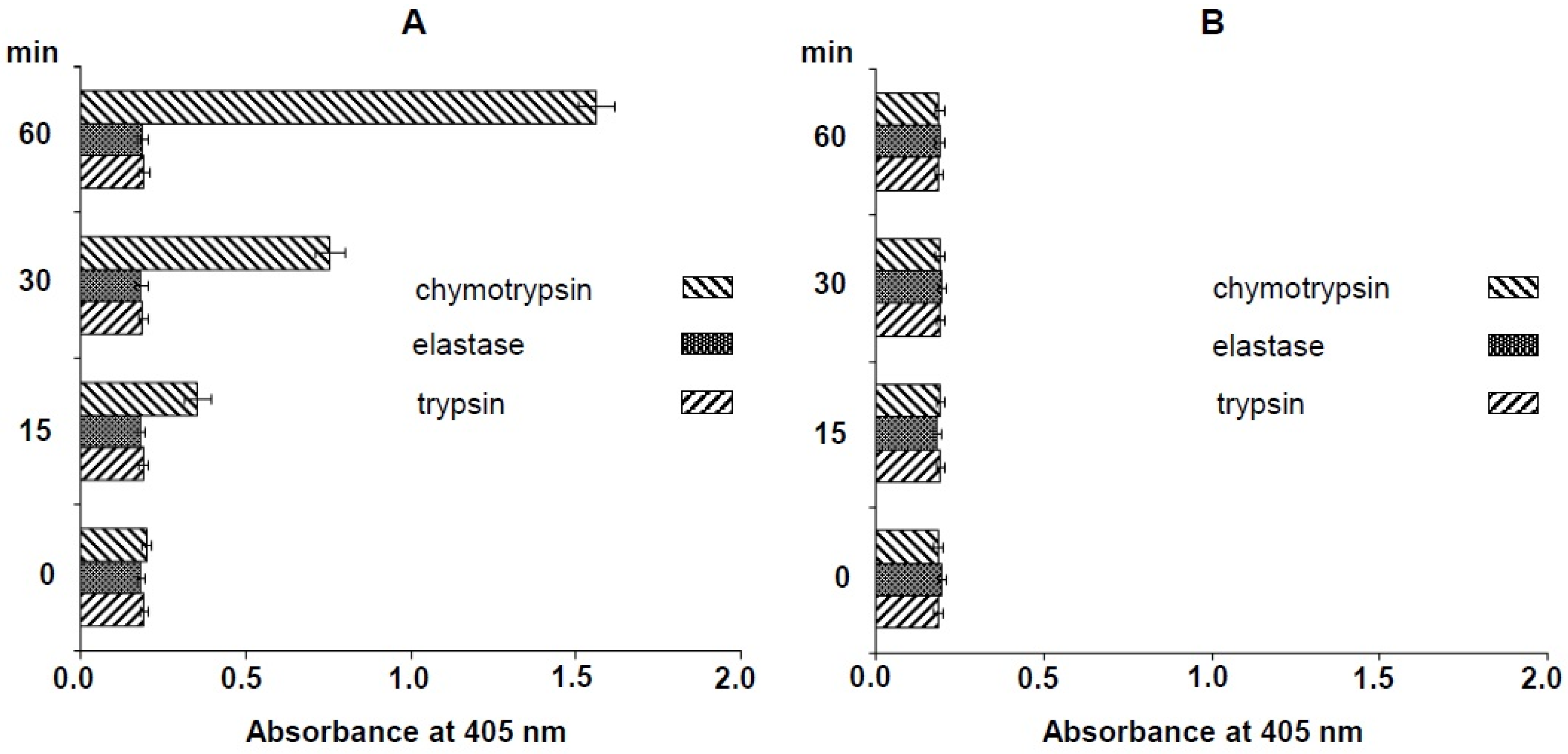 N-Succinyl-Ala-Ala-Ala-p-nitroanilide, N-α-benzoyl-dl-Arg-nitroanilide, and N-succinyl-Ala-Ala-Pro-Phe-p-nitroanilide were used as the substrates to test for elastase, trypsin, and chymotrypsin activities, respectively. The substrates (0.5 mM) were mixed with 0.1 mg of isolated nematocysts for 1 h at 37 °C and the change in absorbance at 405 nm was recorded (BioTek, Winooski, VT, USA).