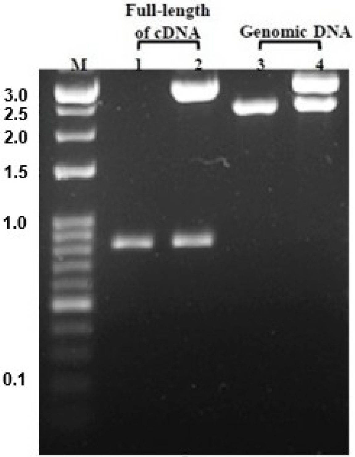 Agarose gel electrophoresis (1.2%) of the pGEM-T/CTRL-1 cDNA and pGEM-T/CTRL-1 genomic DNA after EcoRI digestion. M: 100-bp size marker; lane 1: full-length CTRL-1 cDNA PCR product; lane 2: pGEM-T/CTRL-1 cDNA; lane 3: CTRL-1 genomic DNA PCR product; lane 4: pGEM-T/CTRL-1 genomic DNA.