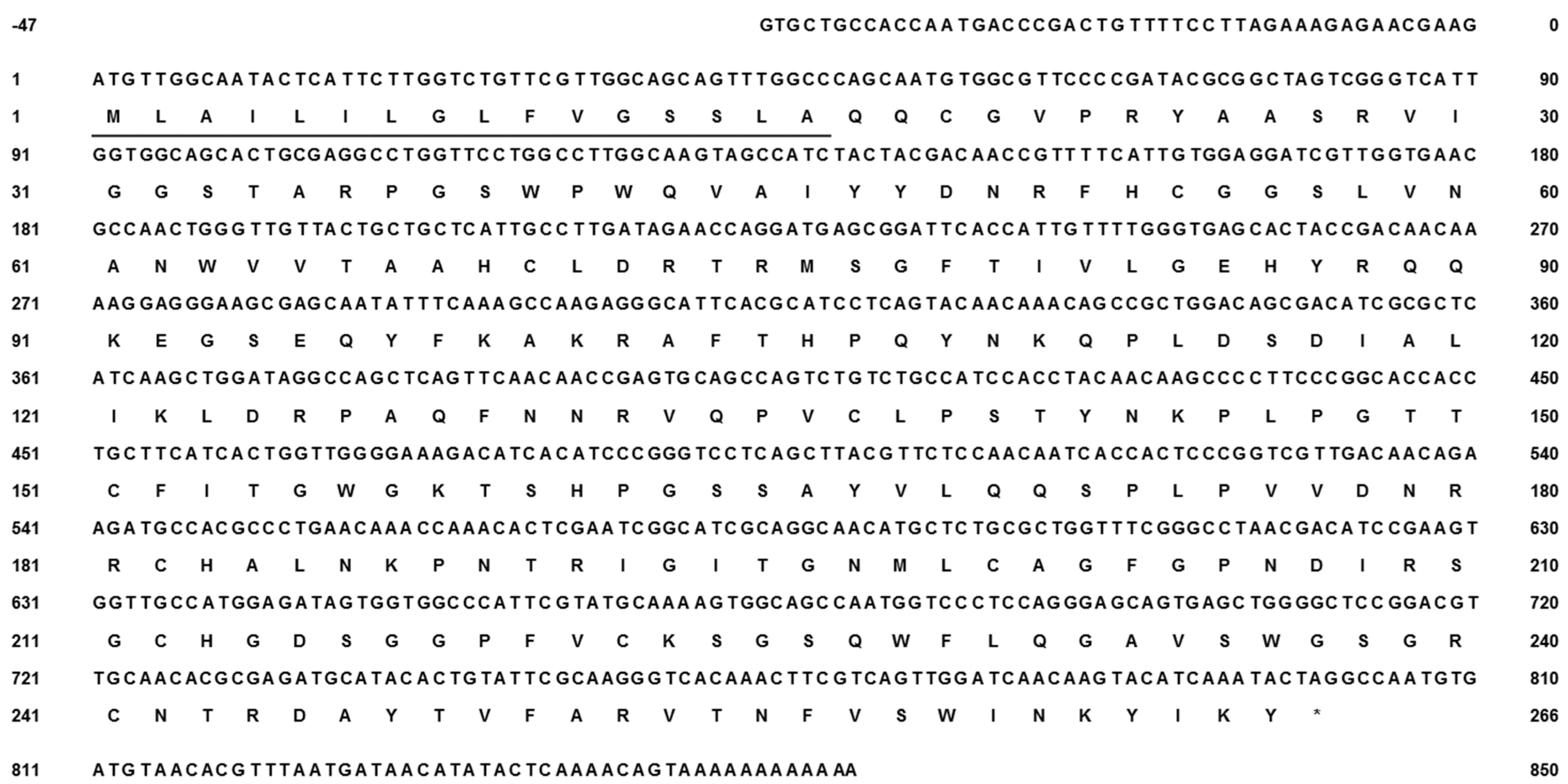 Full-length cDNA and deduced amino acid sequence of N. nomurai chymotrypsin-like protease (CTRL-1). The asterisk and single underline indicate the in-frame stop codon (TAG) and the predicted signal peptide (SignalP 4.1 server), respectively. The double underline indicates the polyadenylation signal (TTTAAT), * represents “Stop”.