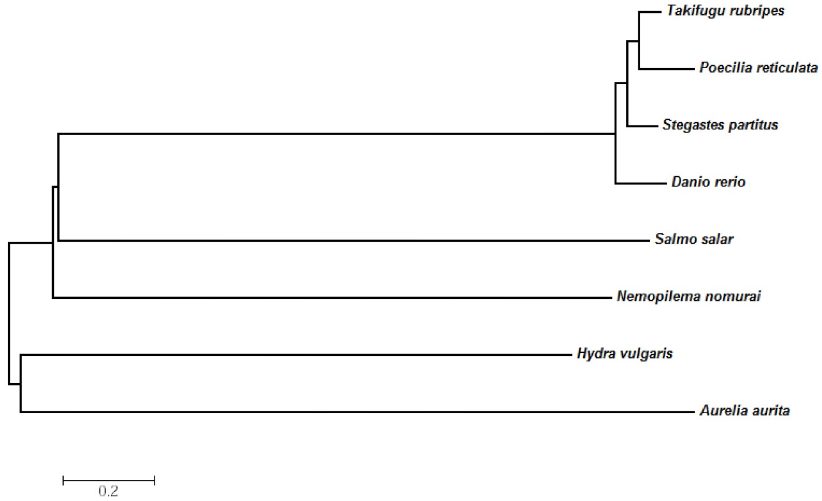 The phylogenetic tree of the N. nomurai CTRL-1 gene, constructed with the MEGA ver. 6.06 software (Center for Evolutionary Medicine and Informatics, Arizona state University, Tempe, AZ, USA), using the neighbor-joining method, Poisson model, and uniform rates. The sequence accession numbers are Hydra vulgaris (XP_002164641.1), Aurelia aurita (AAO12213.1), Danio rerio (NP_001004582.1), Salmo salar (NP_001134565.1), Takifugu rubripes (XP_003966055.1), Poecilia reticulata (XP_008430618.1), and Python bivittatus (XP_007421153.1).