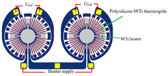 The sensor contains two circular membranes of 900 µm diameter (a catalytic membrane and a reference membrane) and two thermopiles (24 thermocouples connected in series in each) of a combination of WTi-polysilicon encircling the membrane, as shown in the Figure 1. The width of the WTi and polysilicon thermoelectric elements is 12 µm and 8 µm respectively. The three contact points of the heater facilitates the use of an individual power supply and temperature controlling. The hot junctions of the thermocouple are placed very close to the heater, i.e., 5 µm apart. This is because the closer the thermoelectric elements and the heater are to one another, the is the heat loss and the better the sensitivity [,]. Conversely, the hot and the cold junctions of the thermopiles are placed as far apart from each other as possible to improve the thermoelectric performance []. For this reason, a meander-shaped heater is avoided. According to the main idea of the sensor, the hydrogen combustion reaction occurs only on the membrane on which the catalyst is. The temperature difference between the hot and the cold junctions of the catalytic thermopile increases due to the heat of the reaction that increases the thermoelectric voltage (Ucat). Conversely, the thermopile voltage of the reference membrane (Uref) remains constant unless an environmental change (such as a change of the gas flow rate) occurs which alters the heat balance between the hot and cold junctions of the membranes. The output of the sensor is the difference between the two thermopile voltages.
