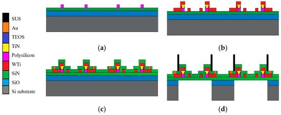 Schematic diagram of the fabrication steps of the sensor, after (a) the deposition of silicon oxide, first phase of SiN and structuring of polysilicon layers; (b) the structuring of TEOS, TiN, WTi layers; (c) deposition of the second phase of SiN layer; (d) deposition and structuring of SU8 layer and backside (Si) structuring (membrane opening) [] (Reproduced with permission from Pranti, A.; Loof, D.; Kunz, S.; Zielasek, V.; Bäumer, M.; Lang, W., Ligand-Linked Nanoparticles-Based Hydrogen Gas Sensor with Excellent Homogeneous Temperature Field and a Comparative Stability Evaluation of Different Ligand-Linked Catalysts; Published by MDPI, 2019).