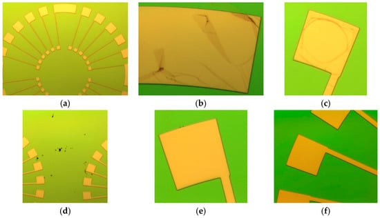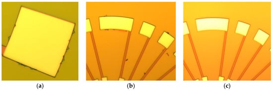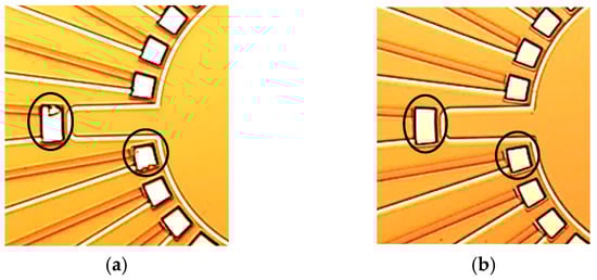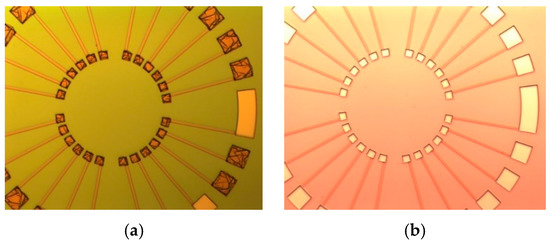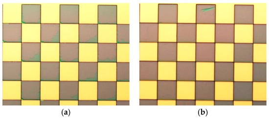 To solve this problem, wet etching was performed in the ‘TiW etch 100’ solution for 3 min 20 s after exposing the wafer to an oxygen plasma of 30 s at 500 W. Immediately after the etching, a dip etch for 20–30 s was done in the photoresist developer AZ 400K of MicroChemicals GmbH, Ulm, Germany. The entire process was done in a room with dim yellow light to avoid exposing of the photoresist. Figure 7a,b show the condition of the structures when the standard wet chemical etching with ‘TiW etch 100’ and the aforemetioned process were done, respectively. No residue of WTi is seen in the Figure 7b, as in Figure 7a.