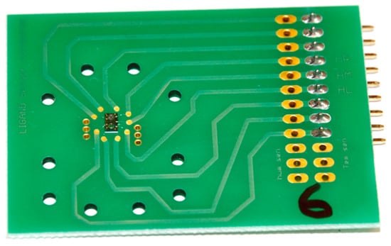 The sensor was pasted onto a PCB board containing gold contact pads, and the heater and the thermopile pads were wire-bonded by aluminum wire for the experiments, as shown in the Figure 8. The temperature distribution on the membrane of the sensor was evaluated using an infrared (IR) camera of InfraTec GmbH, Dresden, Germany with a thermal resolution of <100 bmK, controlled through IRBIS online, version 2.4 software; the data were analyzed by IRBIS plus, version 2.2. To minimize the measurement error caused by the reflection from the surface of the sensor, the measurement was done in a dark room by keeping the camera and the chip in a black box.