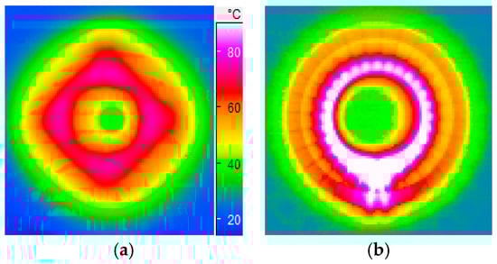 Thermogram for 60 °C average temperature (10V DC supply) (a) design A1, maximum and minimum temperatures are 75 °C and 37 °C respectively; (b) design A3, maximum and minimum temperatures are 128 °C and 37 °C respectively; the temperature difference is less for A1 than A3.
