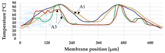 A comparison of the temperature profiles of designs A1 and A3 for a specific maximum temperature, 85 °C, (for both x and y-axis) is shown in the Figure 11. There is a profound peak at the corners in both the x- and y-axes profile of design A3, whereas the peak is smoother for design A1. The root mean square deviation (RMSD) from the standard homogeneous temperature profile for designs A1 and A3 are 18.3 °C (20%) and 44.5 °C (50%) respectively.