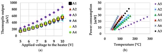 (a) Thermopile output of the sensor with applied voltage; (b) power consumption of the sensor with heater temperature.
