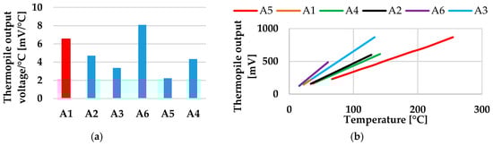Figure 13a shows that the output of the thermopile due to 1 °C temperature difference between the junctions of the thermopile is 6.54 mV for A1 (main design). Surprisingly, the thermopile output of A4 is the lowest, i.e., 4.33 mV, although it contains a higher number of thermocouples than A1. That may be caused by the higher ohmic drop in the thermopile of A4 due to the higher resistance, which is 18 kΩ higher than A1 (Table 2). Similarly, the output of A2 is also very low, 4.69 mV because the resistance of the thermopile is more than double (126% higher) that of A1, which increases the ohmic drop. Conversely, A6 has very high thermopile output, i.e., 8 mV. A possible cause for this may be that the distance between the cold end and the edge of the membrane is higher than it is in A1. Although the Seebeck coefficient is the same, the output per thermocouple per °C temperature difference varies for different designs. The sensor output (thermopile voltage) increases linearly with the temperature difference between the junctions of the thermopile, regardless of the design; see Figure 13b.