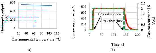 (a) Effect of the environmental temperature on the thermopile output; (b) the response of the sensor to 2% hydrogen gas.
