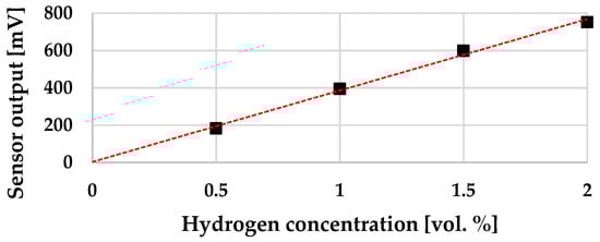 A significant amount of power is consumed by the electronics, i.e., the signal amplifier, booster, or filter, during the operation of the micro sensor []. The most interesting feature of our sensor is that the extremely high sensitivity and noise-free signal of the thermopile eliminate the need for these complicated electronic circuits, thereby reducing the power consumption. The thermoelectric output of the sensor presented by Takashiri et al. was only 83.3 mV for 30 °C temperature difference [], whereas it was almost 200 mV for our sensor. The performance of the sensor in hydrogen was also exceptionally good compared to alternative designs presented by others: e.g., the output of the thermoelectric hydrogen senor presented by Qui et al. was only 3.5 mV for 3% H2 [], and by Nagi et al., was around 0.25 mV for 1.8% H2 []. Park et al., Huang et al., Shin et al., and Houlet et al. also observed very poor outputs in their thermoelectric sensors, i.e., 3.5 mV, 9 mV, 10 mV, and 60 mV respectively for 1% H2 concentration [,,,]. Our sensor showed 395 mV output for 1% H2 concentration, which is about twice the signal that was obtained in similar previous work with ligand-linked, Pt nanoparticles network catalysts, albeit with an old sensor chip design [].