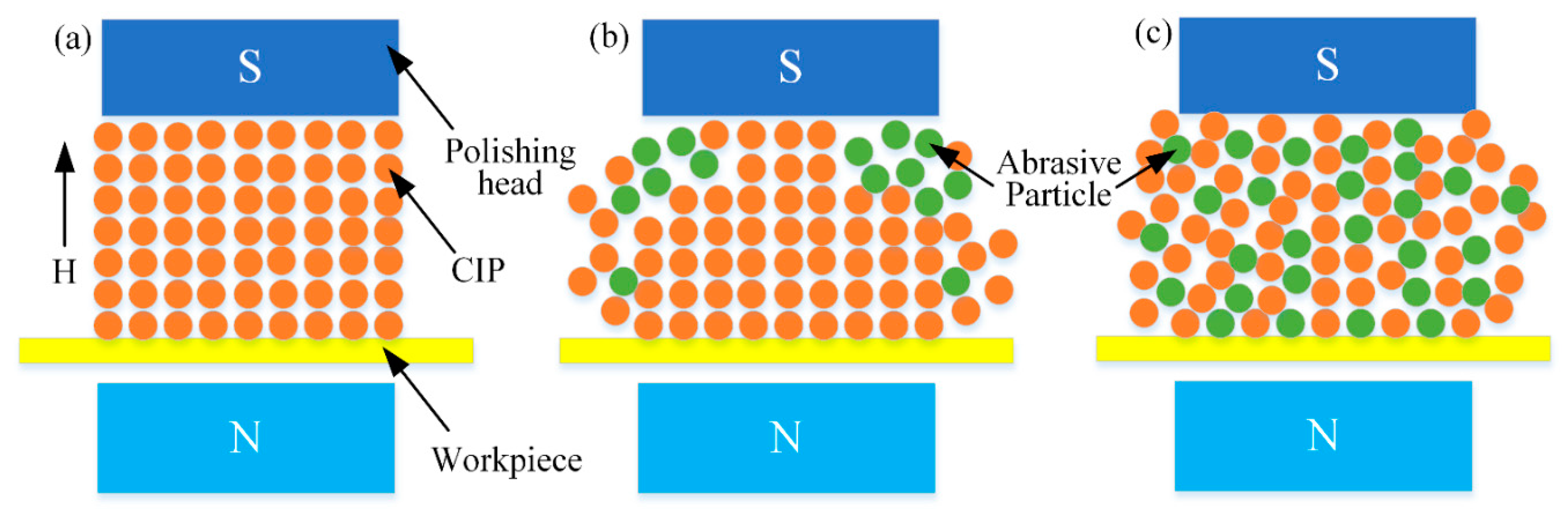 - When no abrasive particles were used in MR polishing, the abrasion caused by CIPs was far from the desired polishing effect. When SiC or diamond were added as abrasive particles to the MR polishing fluid, the polishing efficiency improved. Compared with SiC particles, diamond particles performed better in MR polishing: The surface roughness reduced by Ra 0.299 μm with diamond but only by Ra 0.178 μm with SiC.