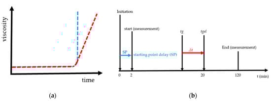The gel point (tg) is the fast increase in viscosity over time and is given graphically in Figure 1a. The blue curve is an example of the steep rise and the red curve with a flat increase of viscosity. Figure 1b gives the graphical overview of starting point delay (SP), gel point (tg) and gelation time (tgel). SP is the time from mixing, e.g., starting the radical polymerization by initiation with TEMED and PPS until starting the measurement with the rheometer. In the case of a determining gel point with rotational rheometry, it is necessary to define the rate of increase in viscosity. It was established by preliminary research [] that for low shear stresses, a steep and sudden increase of the viscosity was measured, Figure 1a blue curve. For higher values a slow and flat increase of the viscosity was present, Figure 1a red curve. We found that the definition of the gel point with 1 mPa·s/s at 293 K led to reproducible, unambiguous and comparable results. In addition to tg the gelation time (tgel) and delta t are plotted in Figure 1b. The gel time corresponds to the time from initiation until a macroscopic gel is formed. For the calculation of delta t, 20 min was assumed for tgel. Delta t is the difference of tgel and tg. In [] the gel point found for very low shear stresses tg = 19.6 min. Further details regarding the method and the examination of the gelation using this principle can be found in [].