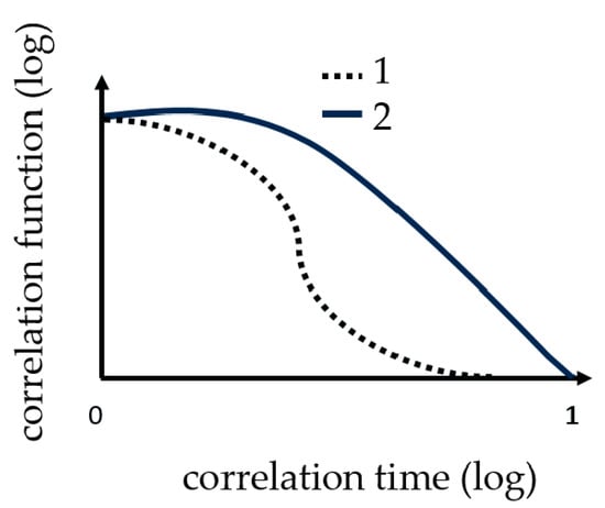 Dynamic light scattering measurements were performed with the ZetasizerNano from Malvern, with a HE-NE Laser 633 nm, maximum 4 mW and the new back scattering method (NIBS) []. The sample was filled in disposable polystyrene cuvettes and capillary cells for testing under shear flow. The folded capillary cell combines the advantages of the measurement accuracy of a capillary cell with the user-friendliness of a disposable cell. The gel point was determined with DLS, because before the gelation threshold was reached, a change in the DLS autocorrelation functions appeared. Further details regarding the method can be found in [,,,,]. Martin et al. demonstrated that the scattering intensity–time correlation function changed from a stretched exponential function to a power-law function, i.e., at the gel point [,]. The change in the correlation function is shown graphically in Figure 2.