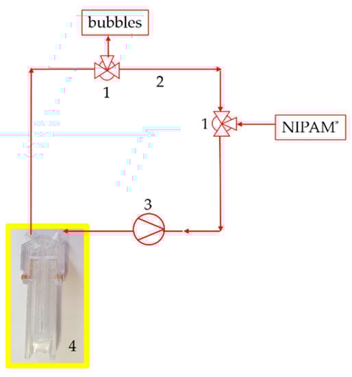 Setup of the dynamic light scattering (DLS) measurement under flow. Two three-way valves (1) as input for NIPAm and output for bubbles with the hose (2) system, the pump (3) and the special cuvette (4).