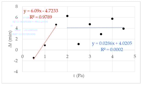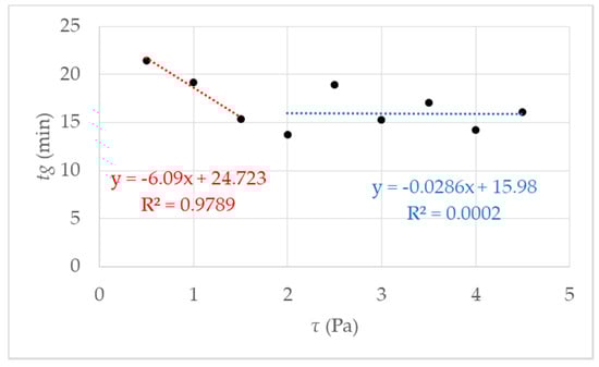 It is an approved method to determine gelling by the fast increase in viscosity over time [,]. The rotational rheometry is characterized by a constant rotational speed of the sample geometry during an examination. By determining the gel point, it is necessary to define the rate of increase in viscosity. It was determined by preliminary research [] that the definition of the gel point at 1 mPa·s/s at 293 K leads to reproducible results. Accordingly, gelling behavior depends on the respective shear stress. Results of measurements using different shear stress τ are presented in Figure 4. The respective shear stress τ strongly influences the gelation of the investigated hydrogel system. At first glance, it seems paradoxical that the gelation time decreases with increasing shear. As we know from our previous work [] that the gelation increase with increasing shear. We prepared a measurement series with 9 data points for τ = 0.5 up to τ = 4.5 Pa. The results are shown in Figure 4.