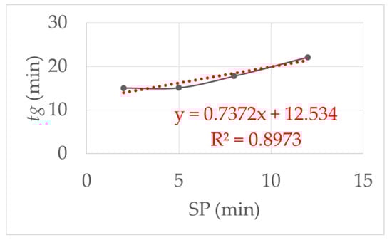 The influence of the starting point delay (SP) was examined experimental. Figure 6 show the results when the SP was varied from 2, 5, 8 and 12 min with the same initial viscosity of the monomer solution. As the SP increased, the gelling time increased. The reason for this is the adsorption of the reactive components on the clay platelets, as described in []. By resting the reaction mixture, the prepolymerization phase was not disturbed, so that it took longer for the polymer chains to come together in a network. This led to an almost linear increase in the gelling time.