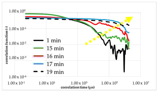 The comparison under increasing mechanical stress is made more difficult by the fluctuation in the viscosity of the monomer solution. Therefore, a single monomer solution was used with all further measurements, i.e., for the calibrations measurements with rheometry, DLS and the measurements with mechanical shear. Within Figure 7 was the first figure calibration measurement (first run) to determine the gel time with the DLS in the resting state (without a flow/shear). The shape of the correlation function changed between 16 and 17 min (red curve) after the start of the reaction (black curve). The blue curve corresponded to 1 min after the change in the shape and the green curve corresponded to 1 min before the change. The dashed line is the correlation function 20 min after the initiation. The yellow arrow shows the direction of the change in the curve shape, i.e., reaction order.