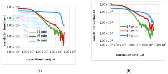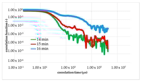 Figure 8a shows the results of the second calibration measurement in the resting state with the DLS, and Figure 8b, the third calibrating measurement. Analogously to Figure 7, the curve of the correlation function changed several minutes after the start of the chemical reaction with adding of the initiator. In Figure 8 is in each diagram, three correlation functions shown and plotted double logarithmically.