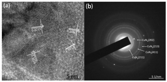 Furthermore, the azide products were analyzed by HRTEM and SAED. Figure 13a,b show the HRTEM and SAED images of the azide product of the Cu2O@CNTs film. There are clear lattice fringes in Figure 13a. Calculated by the software, the interplanar spacings of the material are 0.3215, 0.3026, 0.2060 and 0.1652 nm, which correspond to the (211), (220), (411) and (213) crystal planes of cuprous azide, respectively (the theoretical values of the interplanar spacing are 0.3180, 0.3060, 0.1960 and 0.1675 nm, respectively). It can be determined from SAED that the product is mainly cuprous azide. Figure 13c,d shows the HRTEM and SAED images of the azide product of the Cu@CNTs film. The crystal plane spacings in the figure are 0.3172, 0.2831 and 0.2752 nm, respectively, corresponding to the (230), (021) and (320) crystal planes of copper azide (the theoretical values of the crystal plane spacing are 0.3190, 0.2800 and 0.2762 nm), and the electron diffraction ring in SAED also confirmed that the product is mainly copper azide.